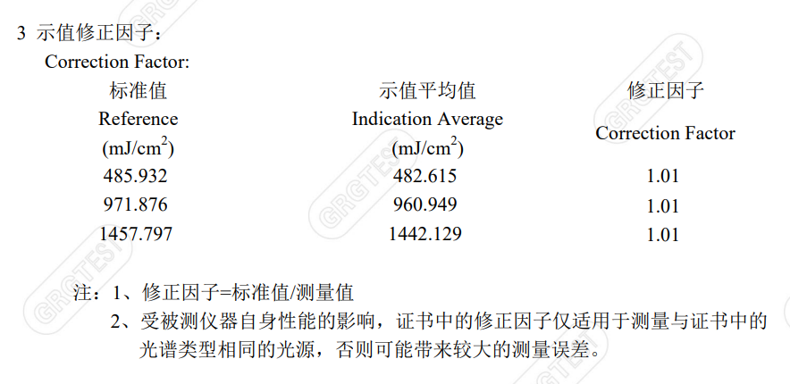 有些计量院的计量报告上修正因子和相对误差只体现其中一项。如果UV能量计厂家的规格书上体现仪器的精度是±10%,那么证书上面的相对误差值在-10%~10%之间才符合要求,越接近0,和标准器之间的差异越小。修正因子的数据则在0.91-1.11之间,数据越接近1,和标准器之间的差异越小。