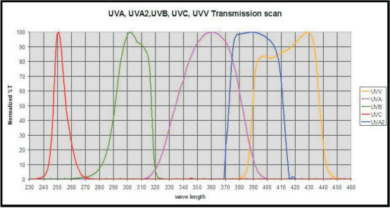 林立光电的紫外能量计借鉴国际知名品牌EIT光谱响应划分方式,如下图所示,UVA通道是测试365nm的光源,光谱响应曲线模拟高压汞灯365nm的波峰和365nm的UV LED光源,UVA2测试385-405nm的UV LED光源,UVV通用于395-430nm之间的LED光源,其中四通道的紫外能量计可涵盖除UVA2以外其他的四个光谱响应,分别显示不同的波段的能量值。
