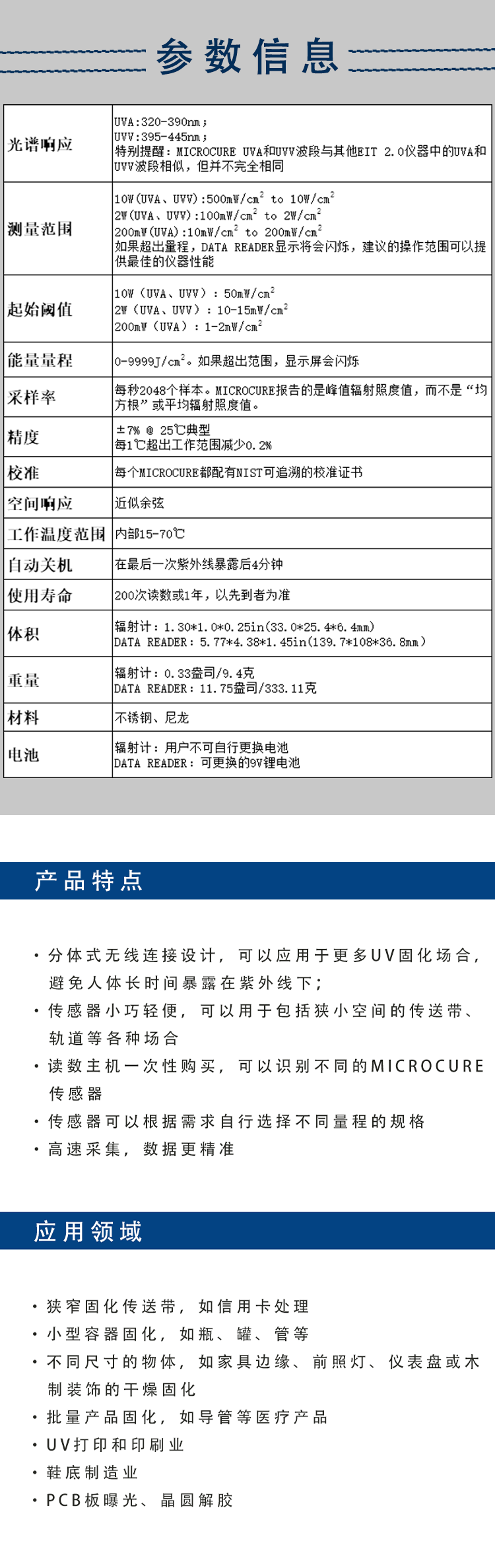 一款分体式无线连接的UV能量计,适用于封闭式、狭小空间等各种场合;